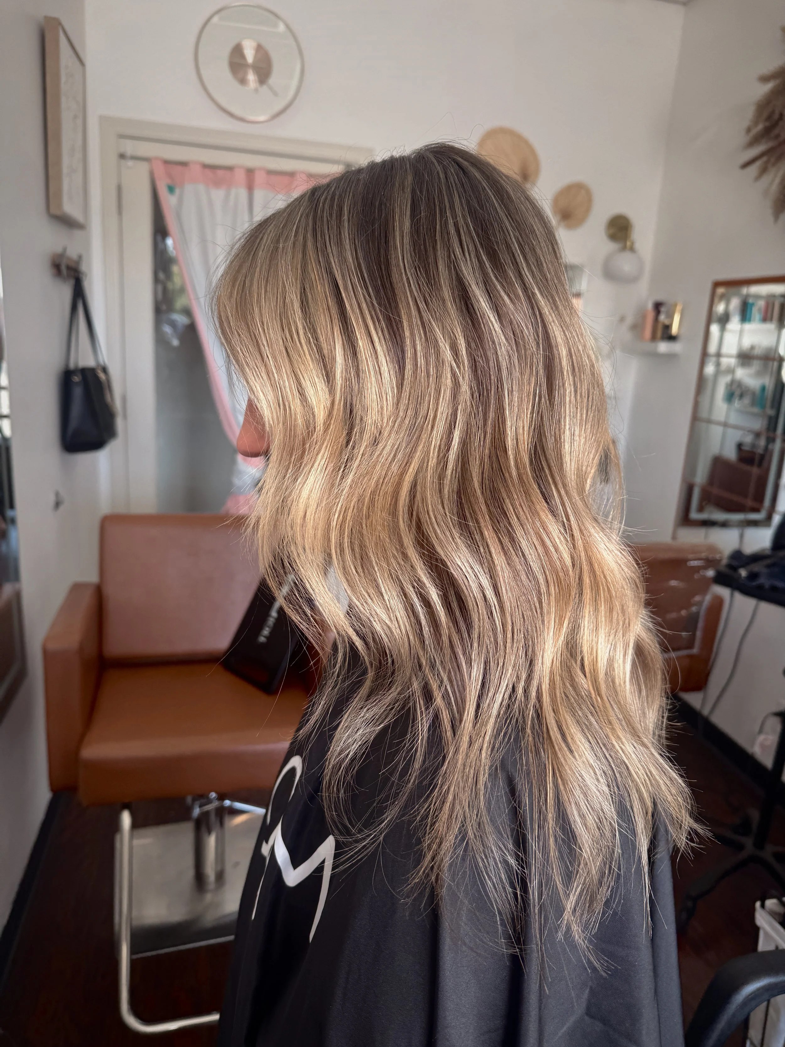 2.5 hours Just a few foils placed around your face and partline to add a pop of brightness! Perfect when you need a little ‘something’ to refresh your color up! This session works best if you’re already blonde since it is just going to add a little ‘pick me up’ around your face. Recommended 6-8 weeks Includes: mini foil, toner, high end treatment, and style of your choice.